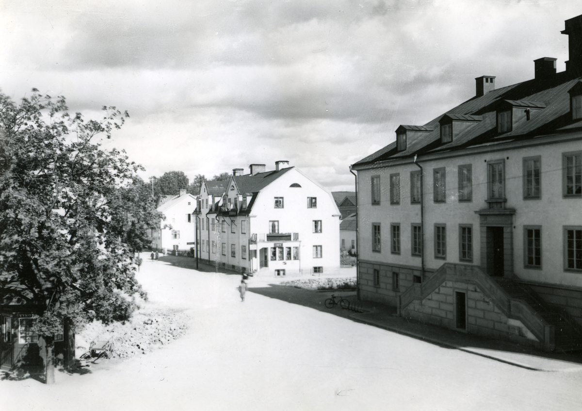 Gatuvy i Bollnäs. Längst ner till vänster syns en kioskbyggnad som säljer tidningar och vykort.