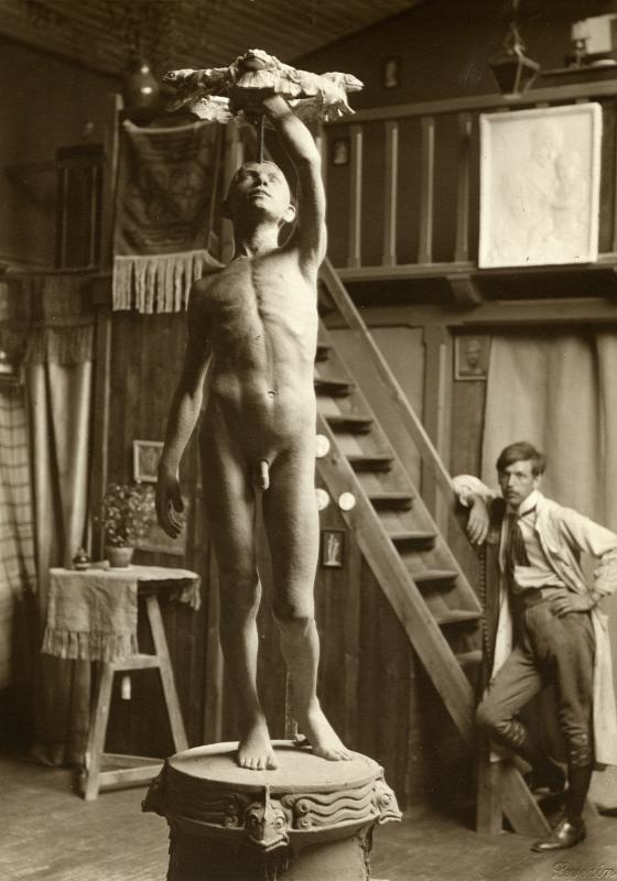 Svartvitt fotografi som visar konstnären Ivar Johnsson i en ateljé. I förgrunden står hans skulptur "Joakim" på en piedestal. Ivar Johnsson står lutad mot en trappa, som ser ut att leda upp till ett loft, i bakgrunden.