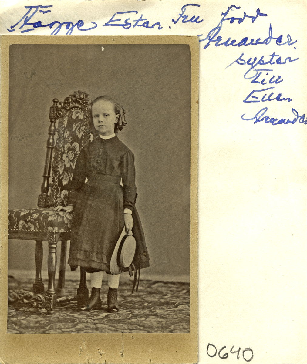Ett av ålder gulnat porträtt av flickan Ester Arnander. Född i ett välbärgat hem i Linköping och där sina första år uppvuxen i familjens våning utmed Kungsgatan. Här porträtterad i uppskattningsvis femårsåldern, med andra ord omkring 1870. I sitt vuxna liv kom Ester att gifta sig med redaktör Bengt Hägge.