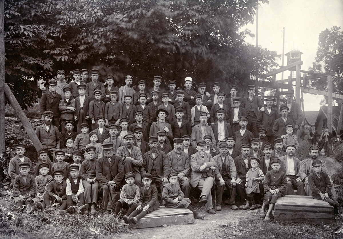 Del av arbetsstyrkan vid Reijmyre glasbruk samlade för fotografering runt hyttmästaren. Foto 1902 möjligen 1903.