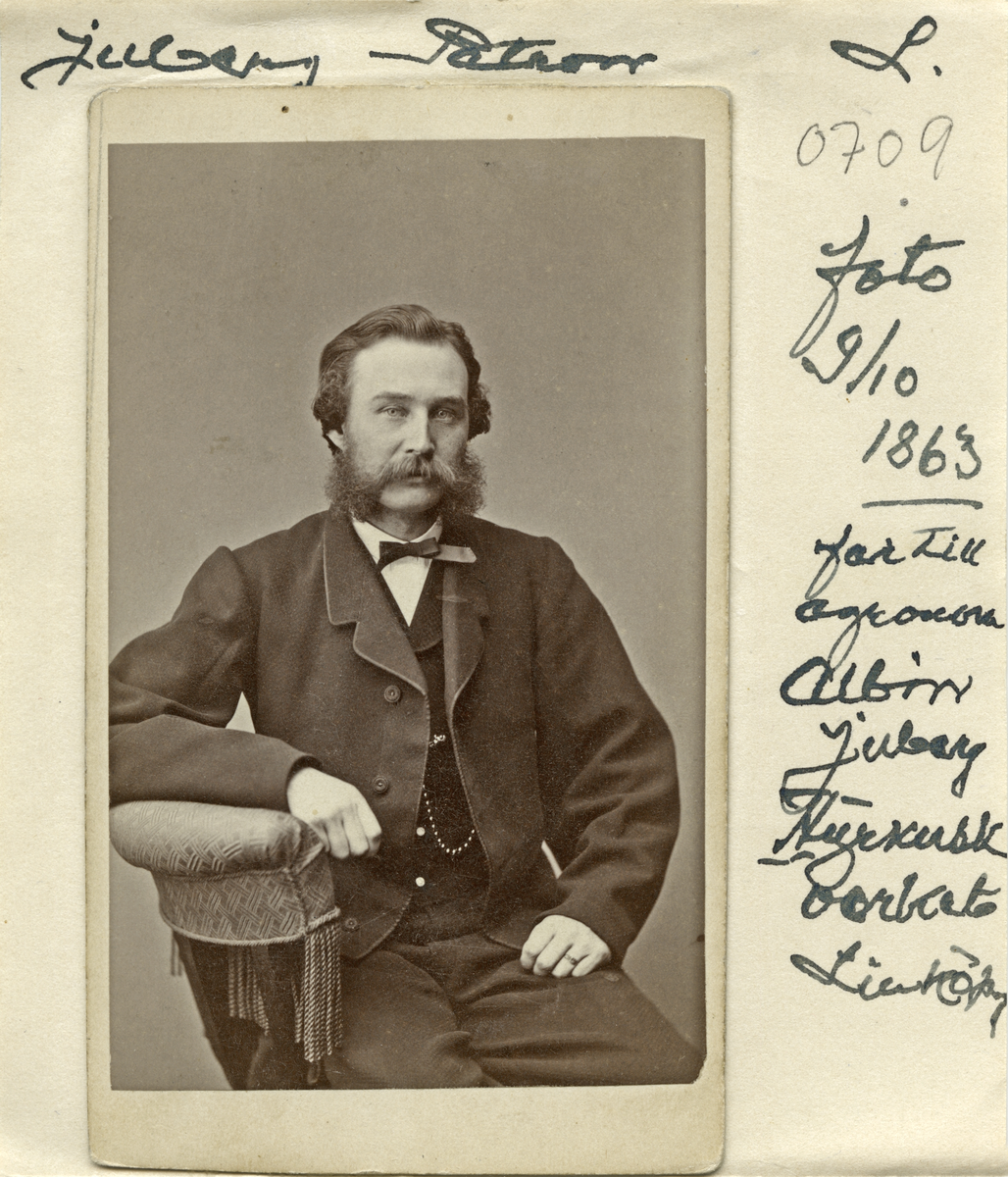 Porträtt av Ludvig Juberg. Född i Linköping kom han under ett flertal år att arrendera Odensgöl i Björsäter. År 1880 bröt han upp från lantlivet för att istället bli skjutsentreprenör och driva Linköpings Skjutsstation & Hyrkuskverk. Verksamheten drevs i förstone från Borgmästaregatan 3, senare mer välbekant från Ågatan 61. En kortare period 1892-93 var han ägare till gården Ljungby i Ekeby församling. Åter i Linköping titulerades han patron. Gift första gången från 1866 med Amalia Wilhelmina Lilja och en andra gång från 1892 med Maria Lovisa Aurora Wilhelmina Lagerfelt.