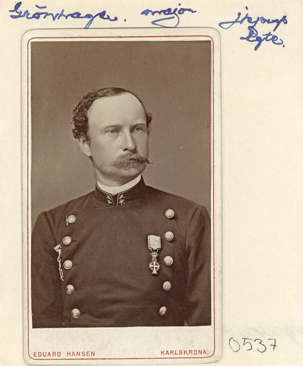 Med Dannebrogordern på bröstet lät Wilhelm Grönhagen porträttera sig i Karlskrona omkring 1875. Utmärkelsen hade han gjort sig värdig genom sitt deltagande i dansk-tyska kriget som avgjordes med slaget vid Dybböl 1864. I övrigt knuten till Jönköpings regemente. Född i östgötska Varv och uppvuxen i södra provinsens Torpa. Från 1877 gift med Agnes Westman, dotter till grosshandlaren i Linköping Gustaf Westman och hustrun Maria Carolina Juberg. Paret kom under senare delen av sina liv att äga Månseryd i Bankeryd och del i Vilseberga i Roglösa.