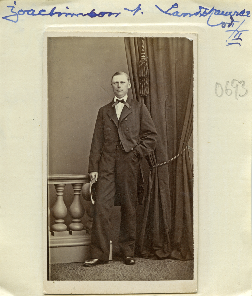 Porträtt av Nils Joachimsson. Bördig från Strå församling kom han att avlägga kameralexamen vid Uppsala universitet 1855. Därefter följde han sin fars yrkesbana som kronofogde i Hanekind och Åkerbo härader. Från 1881 landskamrer vid Länstyrelsen i Linköping. Gift 1860 med Hilma Stånggren. Foto omkring 1865.