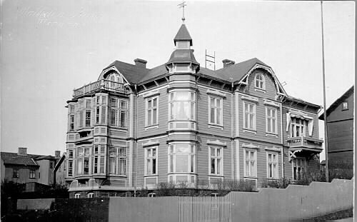 Exteriör. Kv Oxen 1, Engelbrektsgatan-Götagatan. I höger kant syns Engelbrektsgatan. Varberg, Bilden tagen mot nordost. 1920-tal.