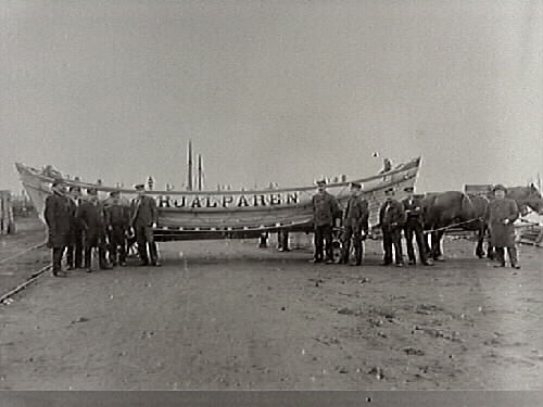 Sjöräddningsbåten "Hjälparen" troligen i Varbergs hamn, uppdragen på land. Intill båten står ett antal män och ett hästekipage som drar båtvagnen. Fr v: Viksten, uppsyningsman för livräddningen; August Bengtsson, båtstyrare; Geelmuyden, hamnkapten i Varberg; Karl Caspersson; Hamra Petters August; Karl Danielsson; Villiam Magnus Lanzén; Anders Danielsson; Karl Halden och en okänd person.