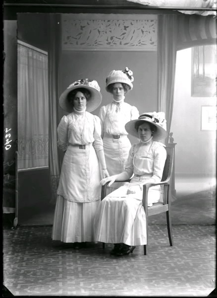 Ateljébild. Tre kvinnor i stora, blomsmyckade hattar och ljus klädsel. Beställare: Berta Larsson.