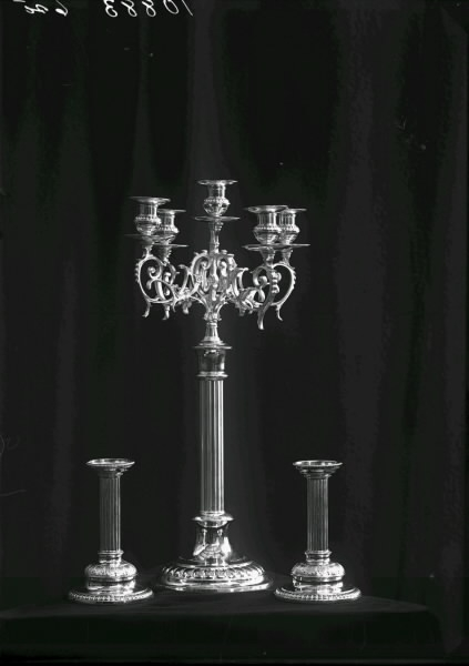 Ateljébild av en kandelaber och två ljusstakar. Förmodligen en reklambild.