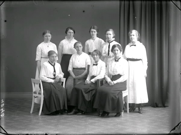 Ateljéfoto med nio unga kvinnor, möjligen en personalgrupp. De bär ljusa blusar, ett par bär slips och några fluga. Beställare: Berta Larsson.