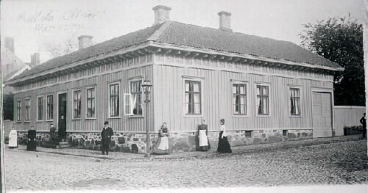 Trähusbebyggelse. Bostadsfastighet i hörnet av Bäckgatan och Östra Långgatan. Den så kallade Lindströmska fastigheten/huset i kv Sadelmakaren 20. Exteriörbild från ca 1890. Aina Rising (1835-1910), som bodde i hörnlägenheten, står här med sina två pigor längs Bäckgatan. Fler personer står längs Östra Långgatan. Här bodde även Herman Rodhe, rektor på gosskolan och grundare av planteringssällskapet Småfoglarnes vänner, som planterade Påskberget. I hörnet står en gatlykta. Bilden är tagen mot nordost.