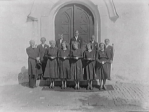 Konfirmander med präst framför en kyrkoport, både flickor och pojkar.