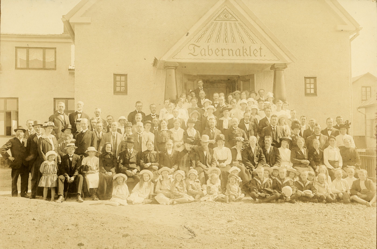 Invigning av baptisternas kyrka, Tabernaklet, på Skansgatan, kv Kaninen 1 i Varberg. Församlingen är samlad framför byggnadens entré som kröns av ett gavelfält dekorerat med det allseende ögat och uppburet av två pelare.