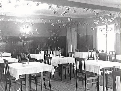 Interiör. Matsalen på Solbackens pensionat i Kärradal. Rummet är dekorerat med blomkvistar.
