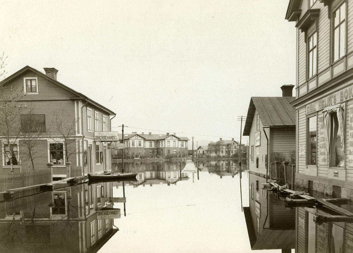 Bollnäs i sekelskiftets dagar. "Ett Nordens Venedig" står det på baksidan, vilket troligen är fotografens egna beskrivning av hur översvämmad staden var.