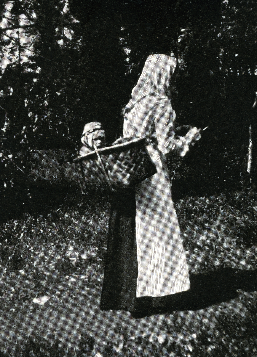 Ett litet barn sitter i en flätad korg som är fäst bak på en kvinnas rygg. Finnskogen. Bollnäs. Okänt årtal.