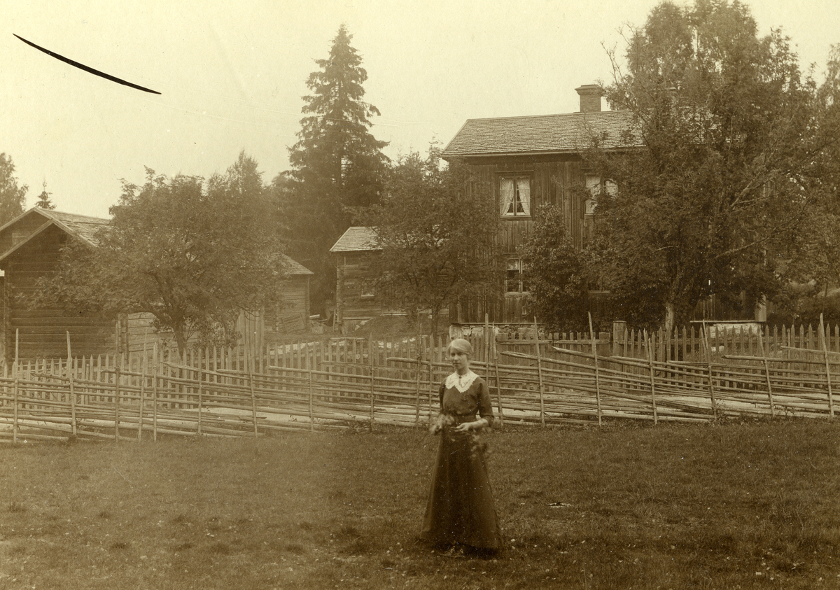 Sommaren 1913. Fröken Anna (el.Karin) Wikman (i Hudiksvall) står framför sin mors släkts hem i Växbo, Bollnäs socken.