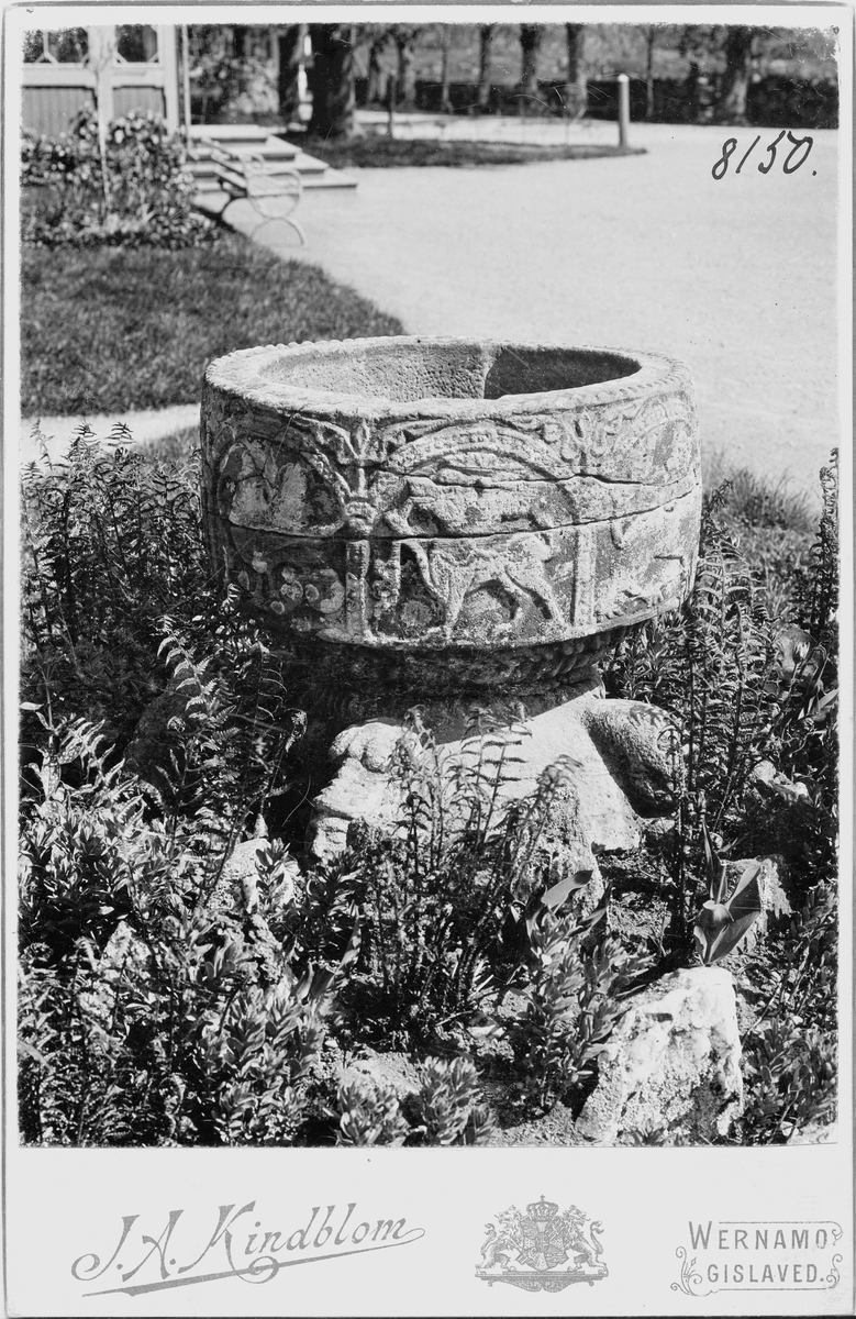 En dopfunt placerad i Lundboholms trädgård, senare deponerad till Voxtorps kyrka, Värnamo.
