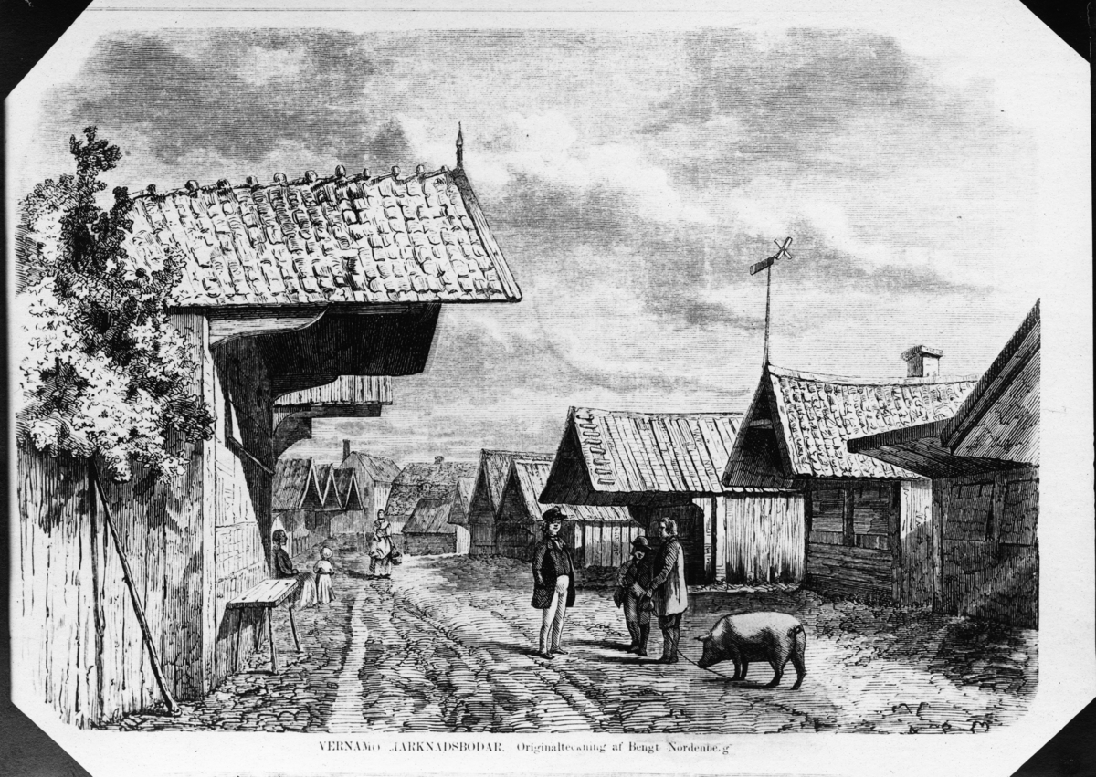 Marknadsbodar i Värnamo.Teckning av Bengt Nordenberg 1866.