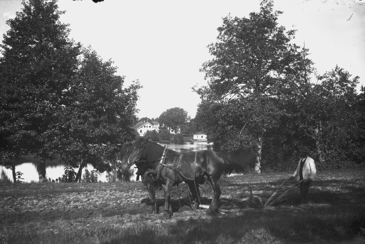 En man plöjer med hästar på fälten vid Eds Herrgård, Värnamo.