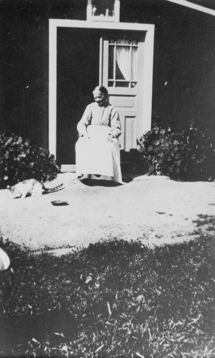 En kvinna sitter utanför "krukmakarens" hos Landins i Västhorja, Värnamo.