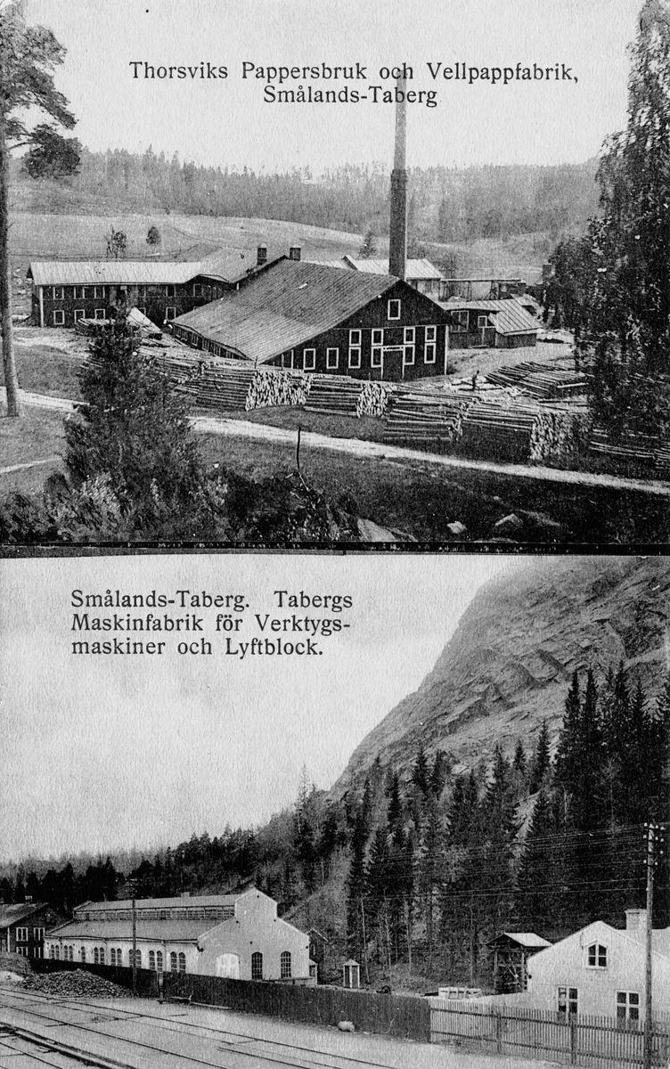 Två industrier i Smålands-Taberg. Thorsviks Pappersbruk och Vellpappfabrik, och Tabergs Maskinfabrik för verktygsmaskiner och lyftblock.