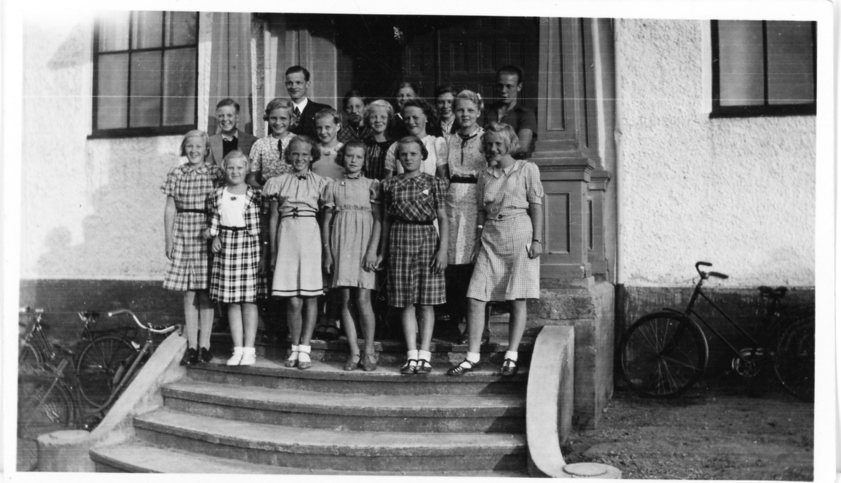 Kållered Missionskyrkas söndagsskolebarn står på trappan till Missionskyrkan, 1930-tal.