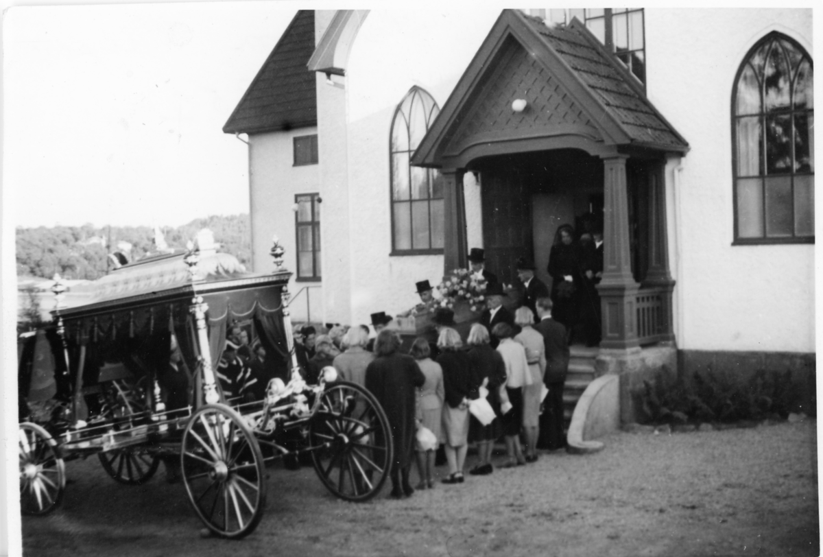 Begravningsvagn på väg ut från Kållereds Missionskyrka år 1952. Det är begravning av Carl-Gustaf Svensson (1911 - 1952).
