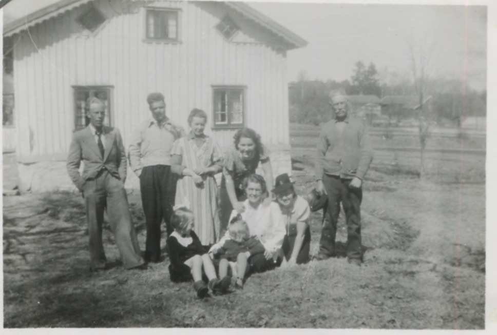 Från vänster: 1. Ragnar Larsson. 2. Axel Törnqvist. 3. Gerda Larsson. 4. Iris "Issi" Larsson (gift Olsson). 5. Fredrik Larsson. Sittande är okända. Gården i bakgrunden är Sporred "Görloffs".