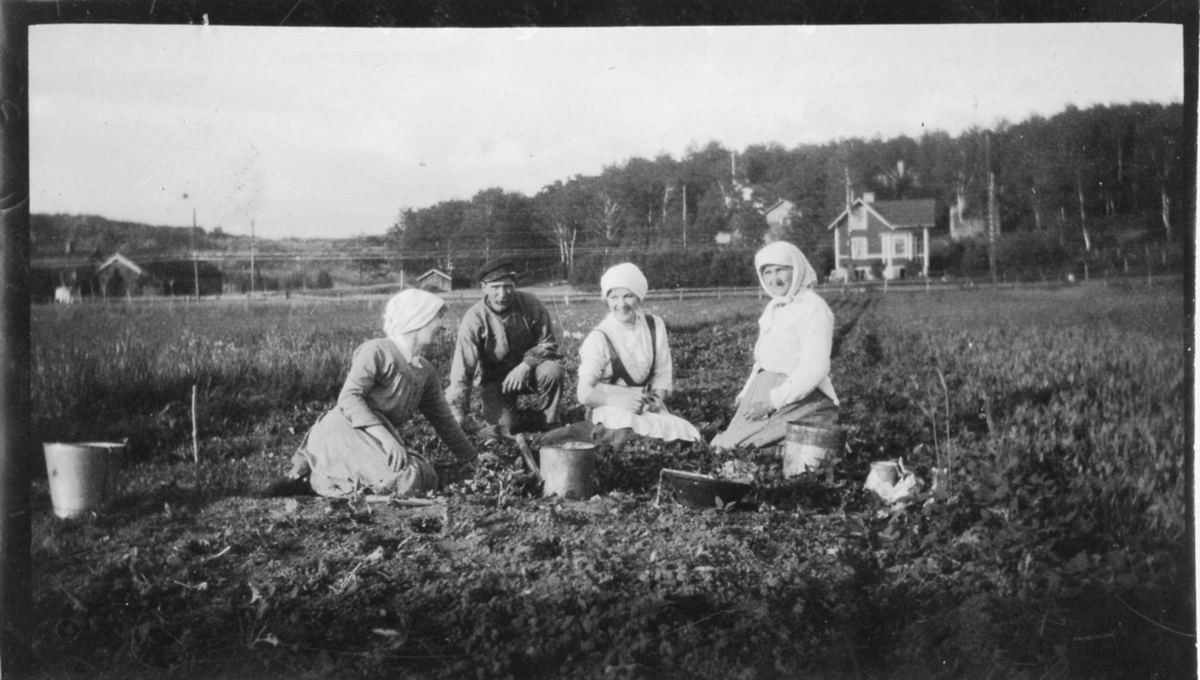Potatisupptagning vid Kärret nedanför Norra Kyrkvägen i Kållered, okänt åtal. Från vänster: 1. Amandus dotter. 2. Amandus Andersson (från Norra Kyrkvägen 3 i Kyrkbacken). 3. Amandus dotter. 4. Amandus hustru Christina. (En av döttrarna hette Anna Maria, född 1897.) I bakgrunden till vänster ses gården Hagen. Till höger ses Fridelund på Gamla riksvägen 58.