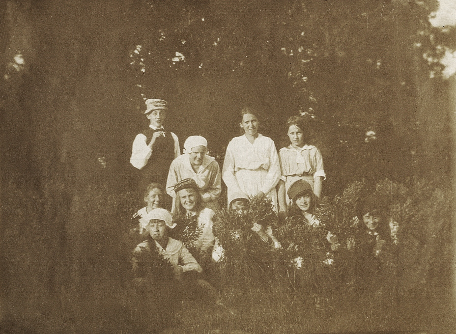 Nio tonårsflickor i ljusa kläder och en pojke med cigarett i handen, har samlats i ett buskage (?).