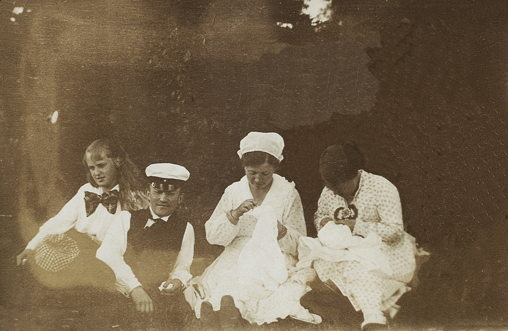 Tre st. unga kvinnor, varav två handarbetar, och en ung man i studentmössa, har slagit sig ner i en skogsglänta.