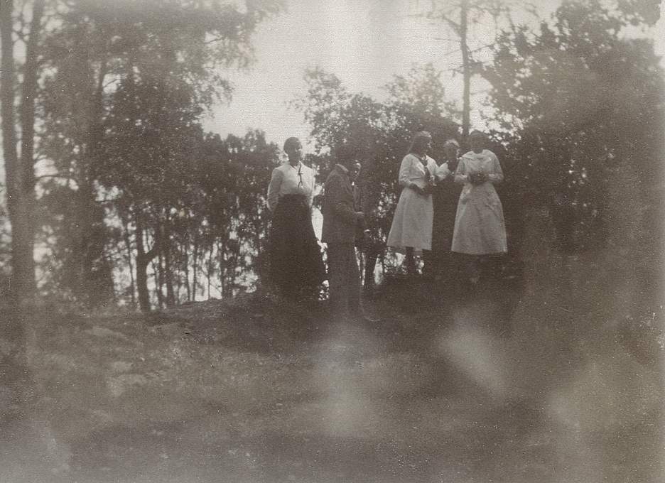 En grupp tonårsflickor i ljusa sommarkläder tillsammans med två unga män i kostym, på en bergsknalle.