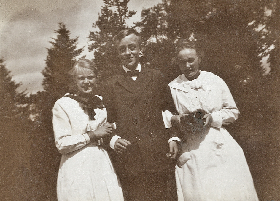 Två tonårsflickor i ljusa sommarkläder tillsammans med en ung man i kostym. En av flickorna håller en lådkamera.