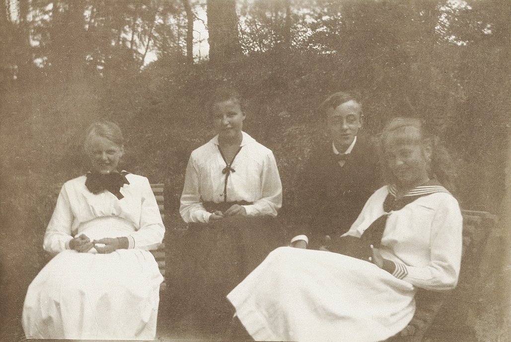 Tre tonårsflickor i ljusa sommarkläder tillsammans med en ung man i kostym sitter på en trädgårdsmöbel.