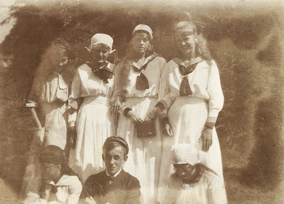 Några tonårsflickor i ljusa sommarkläder tillsammans med en ung man i kostym i en trädgård.