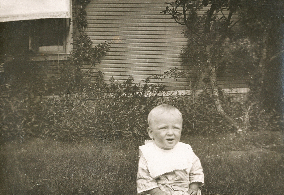 En liten pojke i smårutig kolt och stor krage sitter i en trädgård. I bakgrunden syns ett bostadshus med ett spaljerat fruktträd.