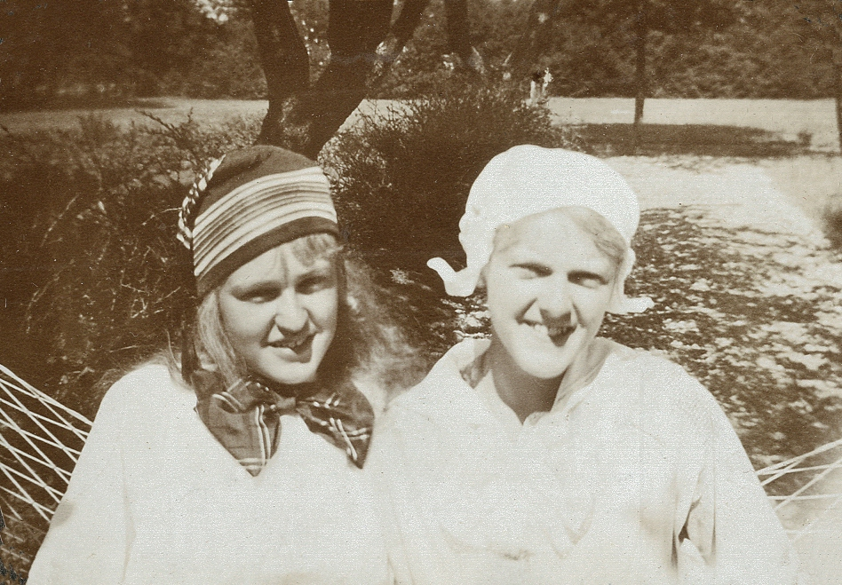 Två leende tonårsflickor sitter tillsammans i en hängmatta av nät i en trädgård.