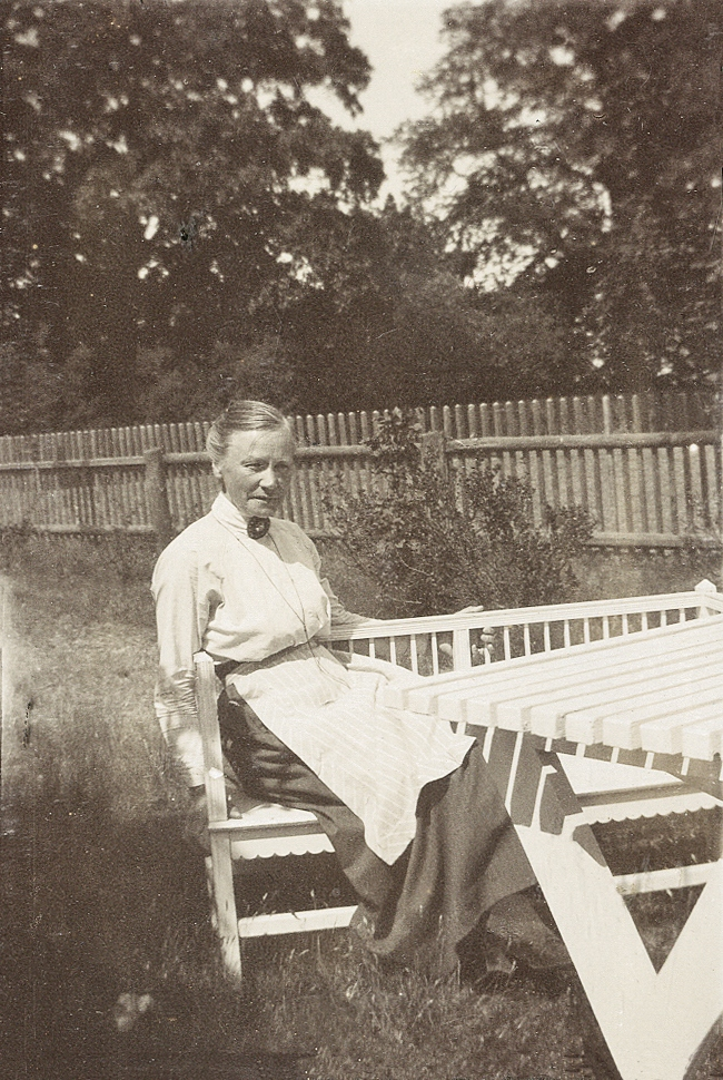 En äldre kvinna i höghalsad blus, kjol och förkläde sitter och tar igen sig i en trädgård, en solig sommardag.
