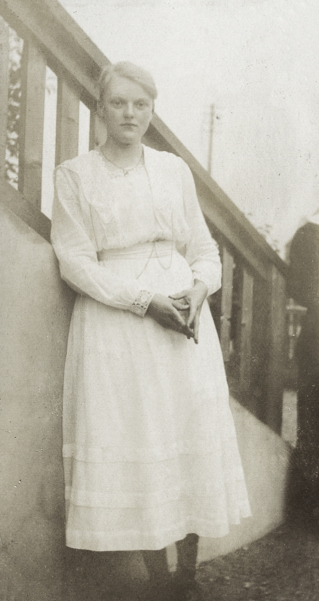 En ung kvinna i ljus sommarklänning poserar vid en yttertrappa.