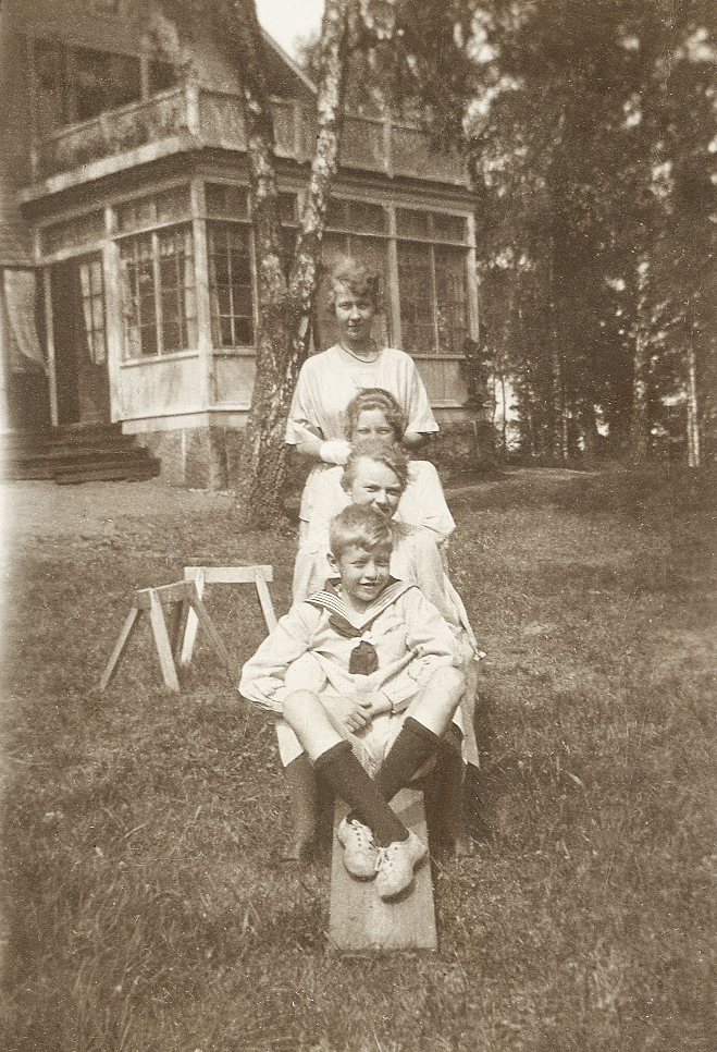 Tre unga kvinnor och en pojke i sjömansdräkt har radat upp sig i trädgården framför en glasveranda.