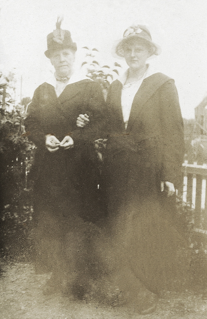 Två kvinnor (mor och dotter?) poserar arm i arm i en trädgård.