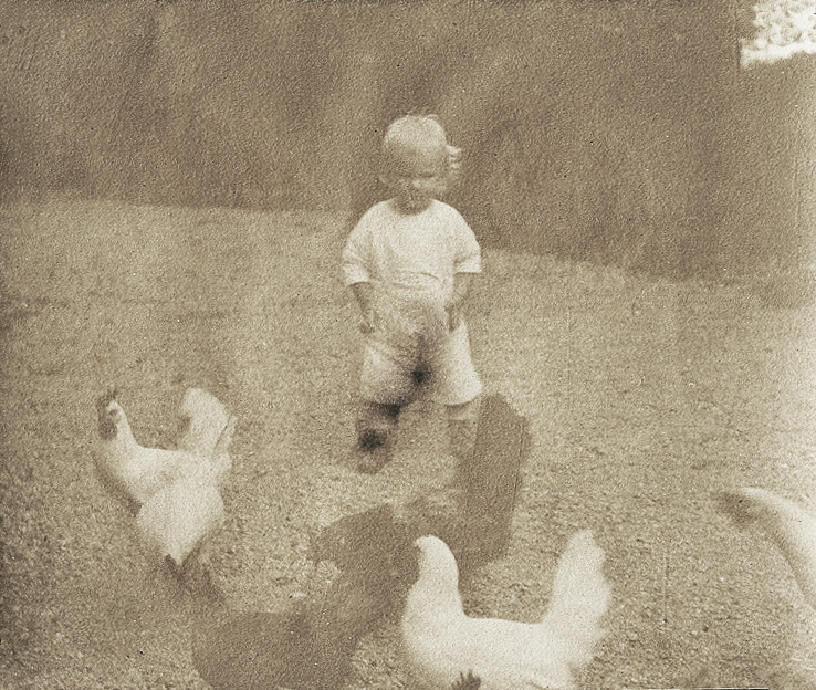En liten pojke på en gårdsplan med några höns.