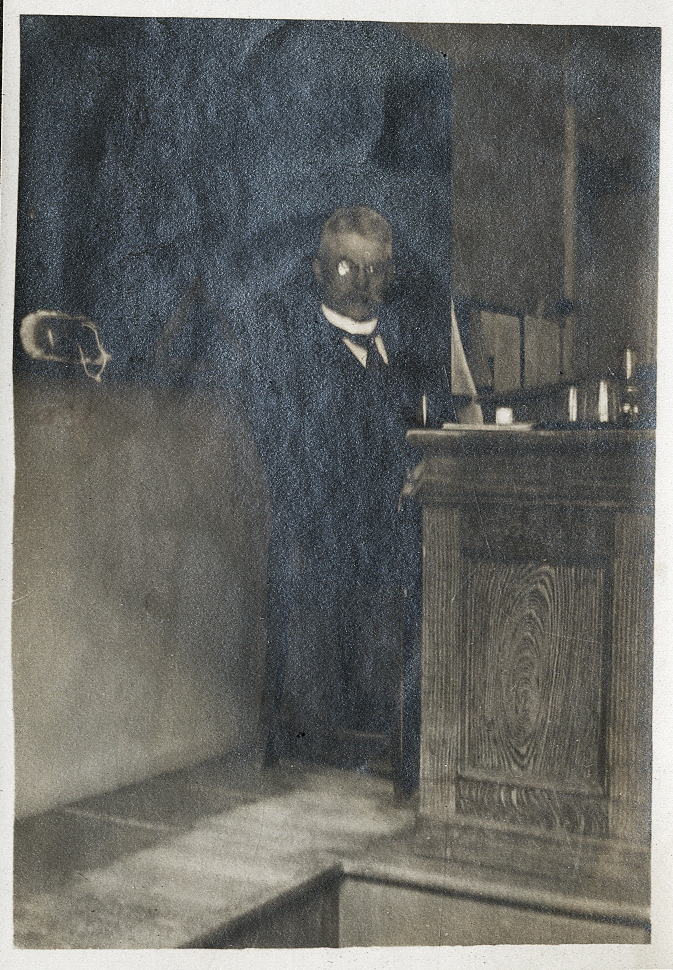 En medelålders man i mörk kostym och glasögon sitter bakom en kateder.