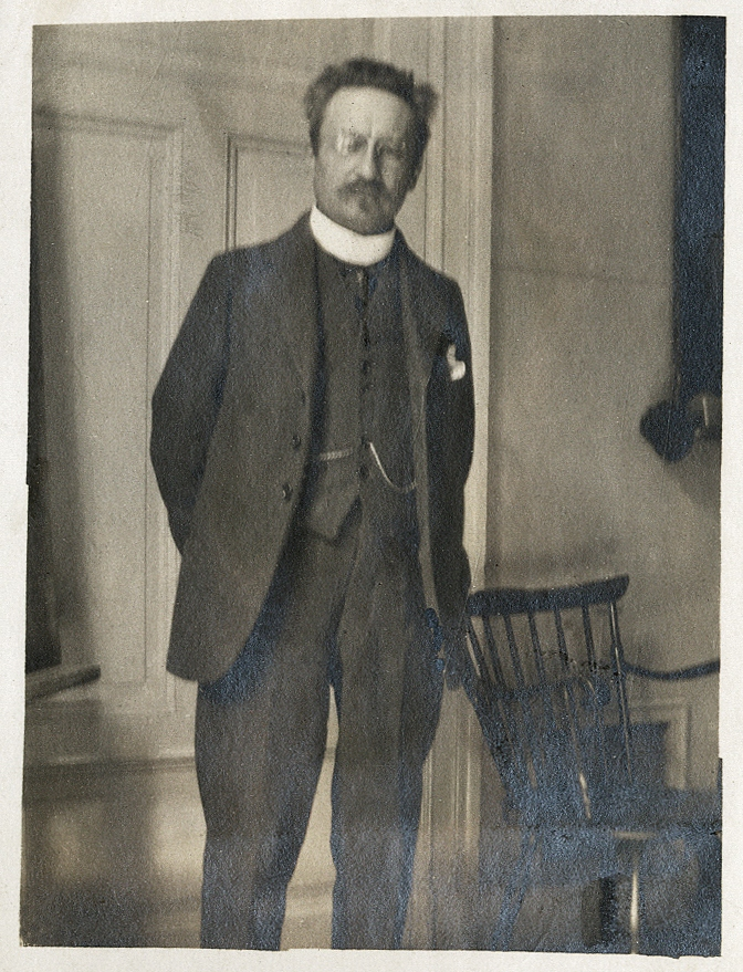 En medelålders man i kostym med väst och glasögon poserar bredvid en karmstol i ett klassrum.