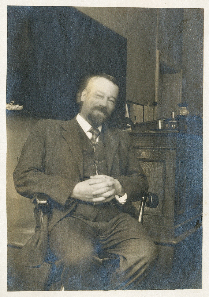 En leende medelålders man i kostym med väst och klockkedja poserar i en karmstol i ett klassrum. I bakgrunden syns en kateder m.m..
