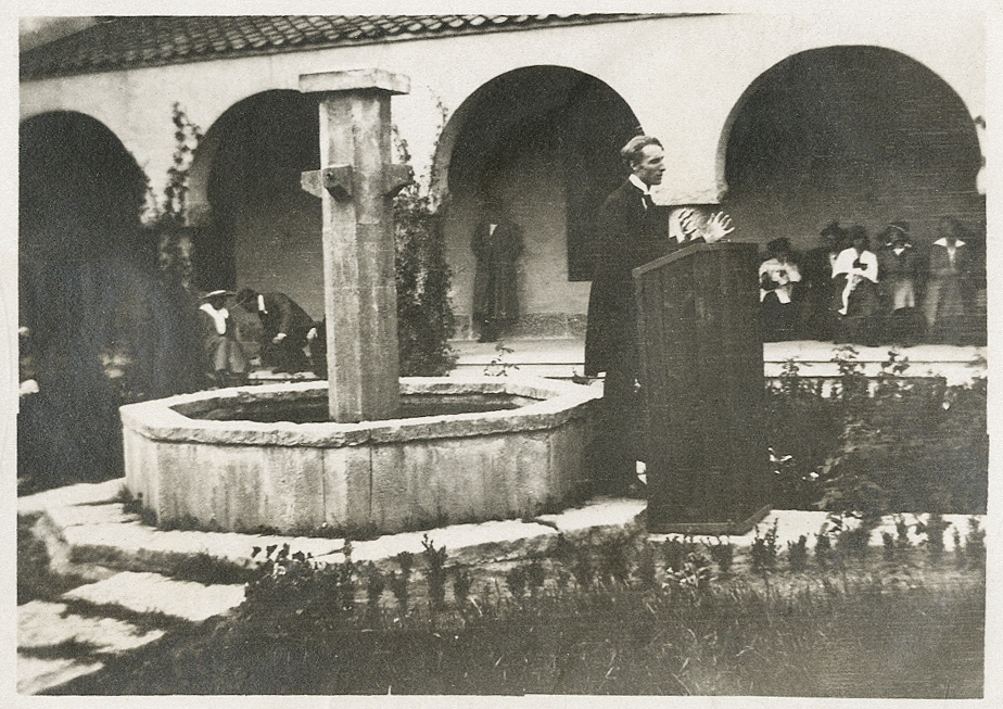 Rektor Manfred Björkquist i talarstolen i atriumgården vid Sigtunastiftelsen, som bildats 1917. En intresserad publik lyssnar i pelargångarna.
