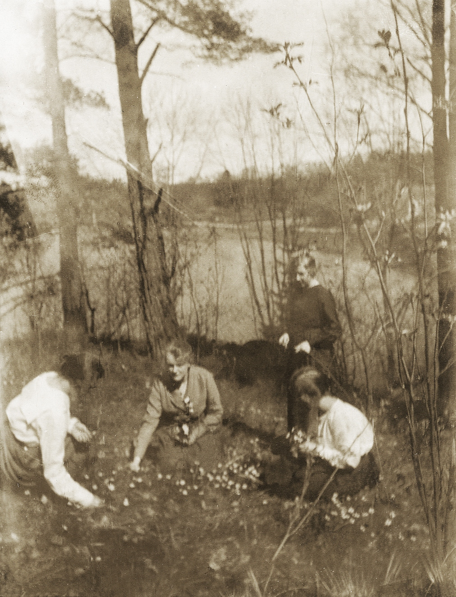 Några kvinnor är ute och plockar vitsippor en solig vårdag. I bakgrunden syns en sjö.