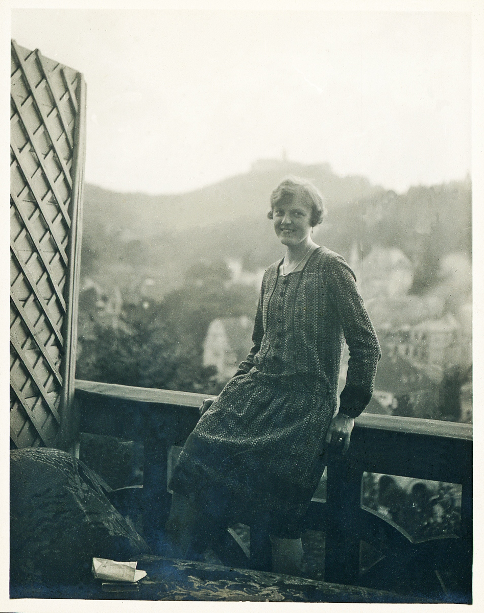En kvinna. Margareta Bergstedt (g. Lidén), lutar sig mot ett balkongräcke. I bakgrunden anar man den berömda borgen Wartburg.
