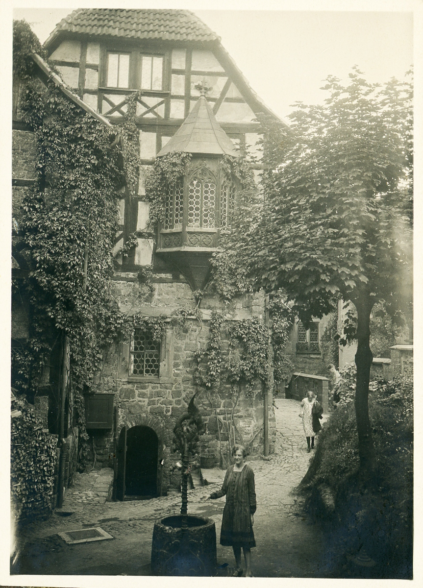 En innergård i Weimars gamla stad med korsvirkeshus och en brunn. Vid sidan om brunnen står en kvinna (Margareta Bergstedt, g. Lidén)