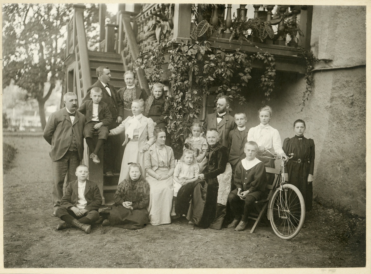 Mellanraden fr.v.: kronofogde Emil Ekedahl, Anders Ekedahl, fru Siri Andersson-Ekedahl, Elisabeth Ekedahl, rektor Hilding Andersson, Sten Andersson (Hildinger), Karin Andersson (Hildinger) g. Hjelmqvist, Gurli Falkenstedt, g. Kuylenstierna.