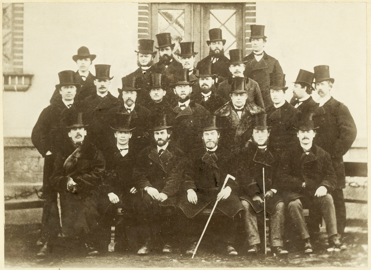 En grupp manliga lärare framför dåv. Växjö läroverk, numera Norrtullskolan, 1875.